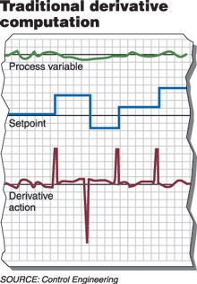 圖1:傳統的PID公式通過對誤差信號進行微分來計算微分項:e(t) = SP(t) - PV(t),其中PV(t)為t時刻的過程變量,SP(t)是設置值,CO(t)為控制器的全部輸出,P、TI及TD 則分別為定義比例、積分及微分項的“整定常數”。 但不幸的是,積分作用并不能保證實現完美的反饋控制。如果積分作用過強,則PI控制器可能引起 “閉環不穩定”(參見CONTROL ENGINEERING 2000年5月刊 “控制器必須以閉環穩定性來平衡性能”一文)。控制器也可能對誤差進行“過校正”,從而引起新的、甚至更大的反向誤差。當發生這種情況時,控制器最終將在“完全開”及“完全關”之間來回驅動其輸出,即開始出現所謂的“振蕩”現象。