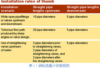 軸承選擇 有多種形式的軸承可供渦輪流量計(jì)選用,包括金屬及陶瓷滾珠軸承以及套筒式碳化鎢及陶瓷滾珠軸承等。 滾珠軸承通常具有最高的精度、最低的成本及最寬的使用范圍,因此它被用于眾多流體中。而碳化鎢及陶瓷滾珠軸承則在維修兼容流體中擁有最高的耐用性。 由于流體一般都能為軸承提供一定程度上的潤滑,因此它所提供的高自然潤滑可延長軸承的使用壽命。 對(duì)于那些流體只能為軸承提供較少或完全不能提供自然潤滑的應(yīng)用,則可使用Hoffer流量控制公司提供的帶自潤滑陶瓷滾珠軸承的單元。 無論流體是否能為渦輪流量計(jì)軸承提供潤滑,廠商們都能采用各種不同技術(shù)來使軸承磨損最小。例如,滾珠軸承單元所包含的非金屬軸承護(hù)圈、硬度極高的碳化鎢及陶瓷滾珠等,都能使軸承的使用壽命延長。 軸承壽命與軸承速度平方近似成反比,因此,為延長渦輪流量計(jì)的使用壽命,最好能讓流量計(jì)工作在較低流速上。例如,如果流量計(jì)在其最大流速的33%上工作,則軸承壽命大約可提高10倍。 對(duì)于采用滾珠軸承的流量計(jì),建議每半年對(duì)軸承進(jìn)行一次檢查。 安裝影響 像大多數(shù)流量計(jì)一樣,渦輪流量計(jì)的精度絕大部分取決于正確的安裝以及能否確保不產(chǎn)生漩渦的運(yùn)行條件。甚至在恒定流速上,漩渦都能改變流體沖擊轉(zhuǎn)子葉片的角度,進(jìn)而改變轉(zhuǎn)子轉(zhuǎn)速并因此而改變液體流速指示。 通過在渦輪流量計(jì)上、下游中安裝足夠長度的流體直通,可減少甚至完全消除漩渦效應(yīng)。流體直通是一種直管與校正葉片的組合,或者像Vortab公司的流量調(diào)理器這樣的專用裝置。用于液體流量測量應(yīng)用的渦輪流量計(jì),在水平及垂直兩個(gè)方向上都能很好地使用,但氣體流量測量應(yīng)用則一般只要求流量計(jì)在垂直方向上具有精確的測量指標(biāo)。 當(dāng)在斷續(xù)液體應(yīng)用中使用時(shí),建議將渦輪流量計(jì)安裝在管道中的較低位置上。 渦輪流量計(jì)一般設(shè)計(jì)用于干凈的流體應(yīng)用中。在可能存在固體的應(yīng)用中,建議安裝篩網(wǎng)或過濾器。但由于篩網(wǎng)或過濾器容易產(chǎn)生漩渦,因此建議將其安裝在直通路徑中的上游位置。