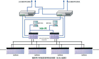 1: 沁北輔控網(wǎng)的網(wǎng)絡(luò)拓?fù)鋱D 輔控網(wǎng)的網(wǎng)絡(luò)拓?fù)洌ㄈ鐖D1): 現(xiàn)場(chǎng)程控控制系統(tǒng)采用QUANTUM PLC和上位機(jī)的兩級(jí)控制結(jié)構(gòu)方式,利用PLC對(duì)現(xiàn)場(chǎng)的設(shè)備進(jìn)行數(shù)據(jù)采集和控制,一般情況下由中央控制室的輔控網(wǎng)操作員站完成對(duì)各個(gè)子系統(tǒng)的監(jiān)控與操作,現(xiàn)場(chǎng)各系統(tǒng)調(diào)試或輔控網(wǎng)絡(luò)故障時(shí)由現(xiàn)場(chǎng)輔助監(jiān)控工作臨時(shí)接替監(jiān)控功能。 控制系統(tǒng)由上位機(jī)和QUANTUM PLC構(gòu)成,上位機(jī)和PLC之間通過MB+進(jìn)行通訊。控制主機(jī)型號(hào)為140CPU43412或140CPU53414。CPU采用雙機(jī)熱備。在本地站與遠(yuǎn)程I/O分站均采用雙纜冗余結(jié)構(gòu)通訊,以提高整個(gè)系統(tǒng)的可靠性。控制系統(tǒng)的PLC配置如圖2所示。
