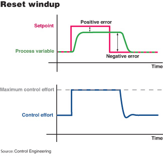 在這個簡單的典型控制回路中,一個比例參數(shù)為2的比例控制器調(diào)節(jié)著一個穩(wěn)態(tài)增進(jìn)系數(shù)為3的控制過程。 這就是說,控制器將偏差乘以2作為控制機(jī)構(gòu)的調(diào)節(jié)量,同時,這個調(diào)節(jié)量被乘以3來產(chǎn)生過程變量值(伴隨著一些短暫的振動)。如果設(shè)定點(diǎn)為70%,那么振動過后,最終過程變量會停止在60%。雖然這時偏差仍未被消除,但控制器不會再做任何進(jìn)一步的調(diào)整。 再調(diào)飽和 積分控制適用于控制回路中調(diào)節(jié)機(jī)構(gòu)力度不足以滿足所需的巨大調(diào)節(jié)量的情況,例如,火爐無法提供足夠的熱量,閥門過小無法產(chǎn)生足夠的流量,或者已經(jīng)達(dá)到極限無法進(jìn)一步出力的泵。無論是最大輸出還是最小輸出,這種驅(qū)動力度總會在某一個值達(dá)到極限。 當(dāng)這個極限使得過程變量無法繼續(xù)升高時,控制器仍會繼續(xù)計算設(shè)定點(diǎn)與變量間的偏差,累積的過去偏差總量仍在不斷上升,其積分控制動作就開始持續(xù)地增加控制機(jī)構(gòu)的調(diào)節(jié)量。當(dāng)然,由于調(diào)節(jié)機(jī)構(gòu)已經(jīng)達(dá)到最高極限輸出,過程變量值已經(jīng)無法再向設(shè)定點(diǎn)靠近一步。 由于調(diào)節(jié)機(jī)構(gòu)已經(jīng)處于全負(fù)荷運(yùn)作狀態(tài),再調(diào)飽和(reset windup)無法帶來即時的控制效果。但是,如果操作員這時想通過降低設(shè)定點(diǎn)至調(diào)節(jié)機(jī)構(gòu)控制范圍內(nèi)的方法來讓系統(tǒng)恢復(fù)正常,控制器是不會有任何反應(yīng)的。 因為在這段時間內(nèi),調(diào)節(jié)機(jī)構(gòu)的輸出早已達(dá)到100%,由此累積起來的巨大的積分偏差總量造成了這種現(xiàn)象的產(chǎn)生。無論當(dāng)前偏差是多少,這個值會保持很長一段時間。同時,積分控制動作將控制器維持在高輸出狀態(tài),調(diào)節(jié)機(jī)構(gòu)力度始終為最大值。 當(dāng)然,控制器輸出在操作員將設(shè)定點(diǎn)修改低至一定程度時會逐漸開始恢復(fù)正常,積分偏差總量也會開始下降。但是,這么一長串的正偏差累積,還是需要相當(dāng)數(shù)量和時間的負(fù)偏差來消除。在那之前,積分控制動作仍將保持全負(fù)荷輸出的狀態(tài),如下圖所示。 人們已經(jīng)設(shè)計出了一些避免出現(xiàn)再調(diào)飽和現(xiàn)象的方法。大多數(shù)的方法選擇在調(diào)節(jié)機(jī)構(gòu)達(dá)到飽和時關(guān)閉積分控制器,而同時,也通常會進(jìn)行一些額外的調(diào)整,以避免控制器重新激活時無法進(jìn)一步工作的調(diào)節(jié)機(jī)構(gòu)。