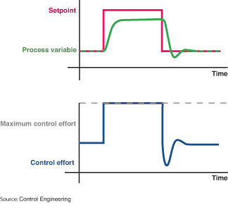這里,操作員對設(shè)定值進(jìn)行了完全相同的操作,所不同的是,這次使用的是帶有再調(diào)飽和保護(hù)的PID控制器。 當(dāng)調(diào)節(jié)機(jī)構(gòu)達(dá)到最大調(diào)節(jié)力度時,保護(hù)程序停止了積分控制動作。這時,雖然過程變量仍然達(dá)不到設(shè)定值,但是在這一過程中,不會出現(xiàn)再調(diào)飽和現(xiàn)象。所以,當(dāng)設(shè)定值恢復(fù)至額定范圍內(nèi),控制器就能立即響應(yīng)并開始調(diào)節(jié)。 全面整合 值得高興的是,上述這些問題都已經(jīng)在現(xiàn)代PID控制器中得到了妥善的解決。再調(diào)飽和保護(hù)、計算過程變量微分和擾動過濾都已經(jīng)成為了大多數(shù)商用PID控制器的標(biāo)準(zhǔn)配置。這幫助了控制器形成內(nèi)部的統(tǒng)一,以最大程度地應(yīng)用每一元素的正面效用。 回路調(diào)試(Loop tuning)是一門選擇合適的P、I、D參數(shù)以實(shí)現(xiàn)對設(shè)定值變化快速、穩(wěn)定地響應(yīng)的藝術(shù)。對PID控制器的使用來說,這是最富挑戰(zhàn)性的工作?上驳氖,人們已經(jīng)開發(fā)出無數(shù)回路調(diào)試技術(shù)和軟件包來幫助處理這些“雜事”。當(dāng)然,人工進(jìn)行調(diào)試仍然是一項挑戰(zhàn),但也已經(jīng)越來越方便了。 |