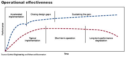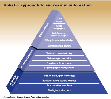 圖3:可以預期,根據集成商提供的應用策略,系統性能會隨著時間下降。所以要采取 措施加快應用、彌補設計差距、保證項目收益。 如果你并不想這么干,那Zeigenfuse就建議你往圖上的更高階層里去尋找集成商。處于第二個階層的集成商除了技術還提供服務,他們不僅派遣技術工作人員進行指導而且還提供項目在技術方面的改進方法和實踐經驗。而最上層的集成商則會教你如何控制人為因素。 最佳系統集成商 Control Engineering2006年12月期刊登了自動化集成商指南幫你尋找經驗豐富的集成商。指南羅列了“最佳系統整合”的詳細說明,并刊登了我們評選出的最佳系統集成商的信息: * Concept Systems(年利潤高達1000萬美元) www.conceptsystemsinc.com * Advanced Atutomation(每年利潤達1000萬~5000萬美元) www.advancedautomation.com * The Benham Companies LLC(年利潤超過5000萬美元) www.benham.com 頂級集成商能夠為用戶帶來一個可持續的生產效益。Zeigenfuse先生指出。“他們不僅僅只是將一個項目完成了事,而是能夠幫助用戶在自動化項目的投資獲得最大化的收益!钡燃壴礁撸晒┻x擇的集成商就越少,聘用他們的費用也越昂貴,不過他們所能產生的價值也越巨大。 5.對于這個項目你們打算采用哪些技術? 盡管決定項目成功與否的風險因素并不僅僅只取決于技術,然而,在選擇可信賴的集成商時用戶必須要考慮技術問題以確保項目成功。所以“為什么集成商建議采用這種方案?”這個問題還是值得一問的。 系統集成電子信息 如果您是系統集成商或經常與他們打交道,您可以選擇訂閱Control Engineering每月發放的系統集成Eletter, 它將免費發送至您的個人電腦中,涵蓋了SI新聞,最新的以太網、無線網絡以及其他工業網絡的相關產品信息;機箱、接頭、連接線以及其他控制元器件產品信息;電源保護和控制產品信息等。訂閱請訪 www.controleng.com。 據Williams的說法就是:“用戶要問問這到底是自己的還是集成商的最佳解決方案。有一部分集成商可能因為價格優惠或是偏好喜愛某種平臺而選擇采用某種技術!彼補充建議用戶問問集成商與項目產品供應商之間是什么樣的關系。 Gurney先生則建議用戶選擇處于行業龍頭地位的集成商,而非擁有專利技術的集成商進行合作。他認為用戶采用模塊和開放式結構的產品會更好些!安捎脴藴实哪K化硬件平臺就能多渠道地獲得技術支持。用戶一旦購買了專利系統,他們也就只能鎖定唯一的供應商提供技術支持了。” 他還補充到:“將離散的硬件整合并不是最大的問題。整合不同的硬件會帶來許多隱性支出,尤其在維修方面。解決整合問題的方法也多種多樣,不過你必須選擇適合你系統結構的方案! 很不幸,并不是所有的技術都具有交互通用性,因此某些部分的整合是必須的,不過這屬于系統集成商的職責范圍。Williams先生說聰明的做法就是找一個集成商,他需做到滿足你生產需要的同時盡量減少特殊化改動。 Zeigenfuse則采用“整體化的”方法來選擇技術。“每個優秀的方案都是具有標準化的特點和功能。為了確保成功的果實,而不讓生產效益發生衰退現象,你必須要有一套長期的方案!彼ㄗh用戶不僅僅要選擇最好的開放技術,還應該制定一整套改進和維修方案以保證自動化技術發揮其最大的功效。(參見圖“自動化項目成功的整體化方案”) 補充問題:項目完成后,我們還能夠獲得哪些服務? 項目啟動之初大家可能都沒有考慮過項目完成之后的一些事宜。Williams、Gurney和Zeigenfuse一致認為自動化項目要取得長期的成功關鍵的一點就是要會為將來做打算。不過事先的確很難預測指定的系統集成商在將來的技術升級和完善中表現會如何。 Williams建議用戶詢問以下問題,“對于系統未來的升級和擴展你們有怎樣的移植計劃?”,“所用的軟硬件組件都具有開放性的構架嗎?或者我需要購買某種專用的硬件/軟件嗎?”他同時指出用戶必須清醒地意識到未來系統的升級和擴展都會帶來額外的支出。優秀的集成商能夠對未來的這種支出給出大致預算。 Zeigenfuse還補充說明到選擇集成商有一點非常重要,在整個自動化系統的使用壽命期內他都能夠提供服務!巴ǔG闆r下,一個項目進入收尾階段,集成商應該將整個項目的關鍵技術移交用戶。而用戶本身能力亦有高低,系統的生產狀況也會隨其能力所限慢慢衰減,到一定的程度時就需要后續改進工程。我們將盡力保證系統正常運行,讓它發揮出最大潛能!彼^的“操作效率”策略如圖所示。 |
