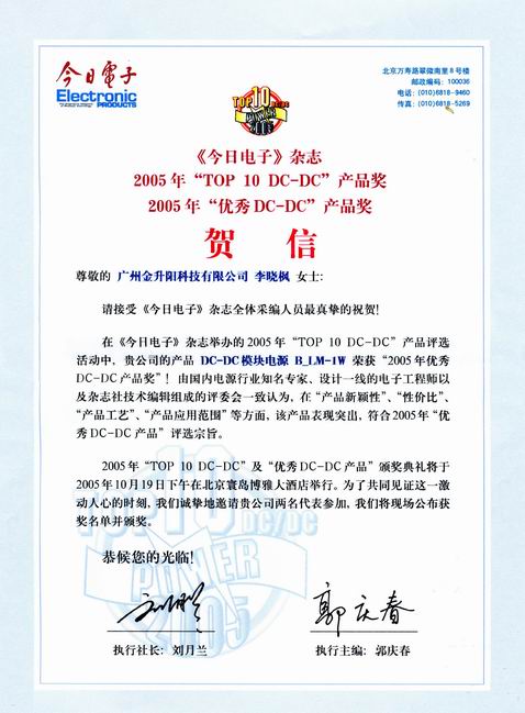 《今日電子》雜志社舉行的“2005年TOP10 DC-DC獎”、“2005年優秀DC-DC產品獎”評選活動,MORNSUN公司產品名列其中,這些評選活動結果由讀者自由投票以及權威專家評比產生,所得評比結果公平、公正。其中獲獎產品之一的, MORNSUN公司現熱銷產品B_LM-1W電源模塊,在國內外的銷量一直穩居榜首的,深受廣大客戶的好評,這次評選活動又一次有力地證實了MORNSUN公司產品無論從研發技術、產品可靠性、產品性能來說在行業中都首屈一指,值得信賴。