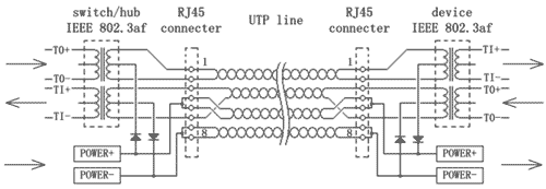 (4) 以太網的供電問題,多年來一直是一個缺陷,特別是隨著IP電話、IP攝像機、無線AP、ENC(Ethernet Control System)等系統的應用,人們更提出以太網在傳輸數據的同時,傳送部分能量,以滿足小型網絡設備用電的需求,解決小型網絡設備供電的無序狀態和居高不下的電源布線成本。因此IEEE 802.3af標準呼之即出,已形成一個以太網供電的國際標準,目前3COM、華為、DLINK等公司都有符合802.3af標準的交換機產品。IEEE 802.3af 標準的核心是在滿足802.3 標準的同時,由交換機向網絡終端設備提供48V或24V電源,至此工業以太網的供電問題得到很好的解決,其原理如圖5所示。