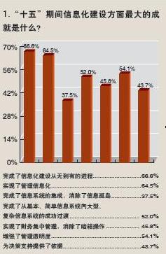 雖然有高達66.6%的受訪企業表示,“十五”期間在信息化建設方面最大的成就是完成了從基本、簡單信息系統向大型、復雜信息系統的成功過渡,但仍有高達52%的企業認為,信息化建設方面最大的遺憾與不足是大型或較大型軟件系統應用未達預期,47.7%的企業認為信息孤島還十分嚴重,這印證了上線僅僅是成功的開始,要深入用好用透還有很長的路要走,很多的工作需要去做。