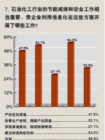 當被問到“石油化工行業的節能減排和安全工作相當重要,貴企業利用信息化在這些方面開展了哪些工作?”時,54.2%的企業回答建立了“建立快速響應機制”,52.1%的企業回答加強“監管生產流程、提高產品質量”,47.5%的企業回答“嚴控進貨渠道”,27.1%的企業回答“加強渠道建設、縮短銷售周期”,還有33.3%的企業回答沒有做任何事情。