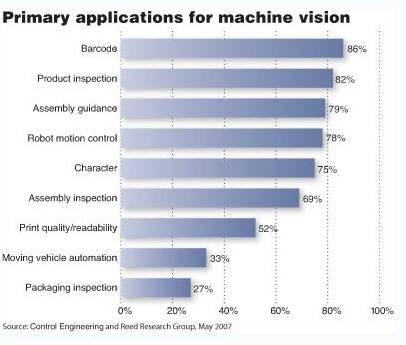 機器視覺的使用范圍遠遠超出了質量控制。如下面的直方圖所示,在被調查的對象中,讀條形碼、產品檢驗、裝配驅動以及機器運行控制是最主要的運用。2007年的調查顯示,機器視覺的使用率正逐步增加,隨之而來的主要問題在于安裝方面。毫不令人吃驚,30%的被 調查者使用集成的機器視覺商幫助安裝,而15%的未使用集成商的買家表示,他們計劃在下一年采用集成商。我們同時發現,主要生產廠家(見下文)最新的機器視覺產品將重點放在了易用性上。