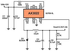 AX3020/3021/3022系列應用上可提供高轉換效能及穩定的工作電壓,該器件還具備有短路保護(SCP),過電流保護(Current-limit Protection)及過溫度保護(Thermal Shutdown Protection)功能,切換頻率固定為200kHz。