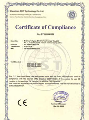 繼2007年11月“SYNTRON森創”伺服驅動器通過CE認證后,2008年2月,“SYNTRON森創”CB、MB系列伺服電機順利通過EMC及LVD測試,成功獲得CE認證證書。