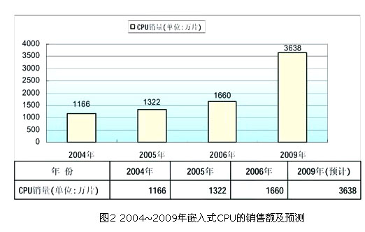 在中國的增長率要超過全球增長。據神州龍芯介紹:中國嵌入式CPU的銷售額及預測如圖2所示。在高增長的同時,95%的嵌入式CPU是進口的,只有C*Core和神州龍芯等區區幾款是國內自己研制的嵌入式CPU(如圖3所示)。因此,發展自主知識產權的32位嵌入式CPU是所有關心民族產業人士的共識。