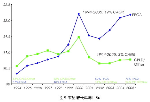 如今,通過進入新市場(例如消費電子),Xilinx預計到2009年將有望增長到228億美元,其中亞太區市場將達到48億美元(根據iSuppli公司05年12月的半導體行業研究報告)。Altera也將通過開發新市場(例如通過Hardcopy技術,進入18億美元的結構化ASIC市場)擴張。