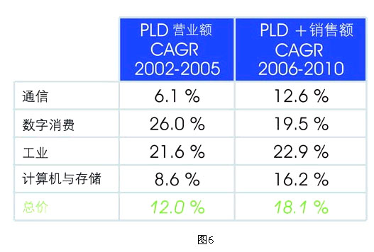 這兩年,革了ASIC命的PLD(可編程邏輯器件)高唱凱歌,逐漸獨樹一幟。整個PLD的營業額如圖4所示,全球PLD市場2005年總值估計約為28億美元。據Xilinx分析,2006日歷年度的PLD市場增長速度預計為12%~16%。Altera預測,今后將以年均增長率17%的速度發展。PLD主要分為CPLD和FPGA,從圖5可看出,CPLD的發展速度平穩,具有潛力的是FPGA。PLD主要用于通信、數字類消費電子、工業、計算機和存儲等領域,Altera分析其增長率如圖5所示。Xilinx預計亞太區業務將會有強勁的增長,其中約40%來自通信領域,約16%來自消費和汽車領域。