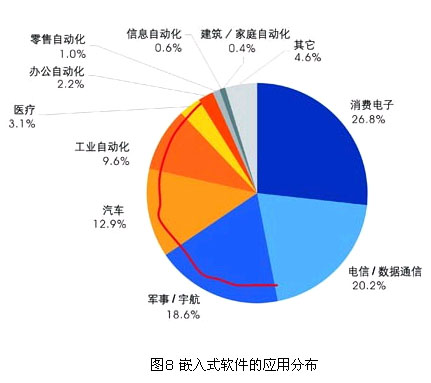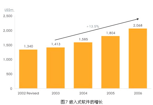 隨著嵌入式系統復雜性的提高,嵌入式軟件扮演著越來越重要的角色:如實時操作系統(RTOS)、編譯器、中間件(Middleware)、嵌入式數據庫(RTDB)和網絡開發平臺等。其中實時操作系統起著尤為關鍵的作用,根據VDC的預估:2005~2008年實時操作系統的復合年均增長率(CAGR)約為13.5%左右(圖7為VDC2004年預估的數值)。
