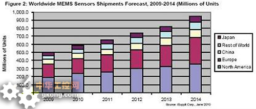 鑒于中國汽車出貨量迅速增長,在該地區已經建立據點的供應商,如Bosch和Continental,都逃過了經濟衰退的最嚴重影響。2009年中國市場占總體MEMS消費量的11%,未來幾年將繼續增長,到2014年將成為全球第三大市場,領先于日本和“世界其它地區”。iSuppli公司認為,這些動態未來五年對于MEMS傳感器供應商來說是好消息。
