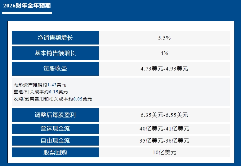 下表為 2026 財年的指導框架。隨著我們將資本配置重心轉向向股東返還現金,2026 財年預期通過約 10 億美元的股票回購與 12 億美元的股息,向股東返還約 22 億美元。