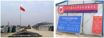 當天中午,我們從成都出發時雨還一直下著,但剛進入德陽地界太陽就出來了,這似乎預示著這場讓人心痛的災難將會很快過去。在這次地震中東汽中學共失去了兩百多名學生和十幾位老師,學校也在瞬間變成了一片瓦礫。但是,當我們駛近東汽中學時,看到的是坐落在一片空曠的場地上的嶄新的板房,遠遠看見高高飄揚的五星紅旗,非常醒目,非常耀眼。