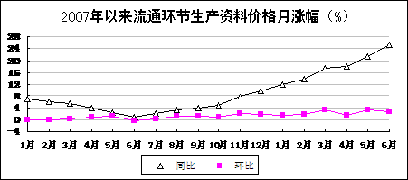 工業品價格漲幅持續提高。上半年,流通環節生產資料價格同比上漲18.1%,漲幅同比提高14.1個百分點。分月來看,環比價格持續上漲,同比漲幅加速攀升,不斷創出歷史新高。其中,6月當月環比上漲2.5%,同比上漲25.3%。
