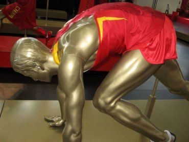 劉翔在北京奧運會上使用的戰靴則盡可能地追求“輕”。鞋面厚度不到2微米,使用的高強度細線仿佛懸索大橋的鋼纜,每根細線的位置精準地設計在劉翔足部需要支撐的部位。跨欄跑往往是前腳掌著地,后腳掌并不會落地,所以鞋的前半底板采用了碳纖板,后底板則采用減震效果好的特質橡膠。劉翔親自參與了鞋子的設計討論,他最喜歡的鞋底部分之一是前掌只有五顆鞋釘的設計,這樣的設計減少了鞋身重量。而符合生物力學研究成果的鞋釘位置也可以減少對足部壓迫點的壓力,并且可以增大抓地能力。