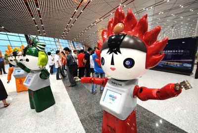 在3號航站樓出港大廳,五個福娃機器人為來往旅客進行列隊表演,機器人的精彩表演,引來過往旅客一片驚呼之聲,一些旅客和福娃機器人留影,并與之進行語言交流。