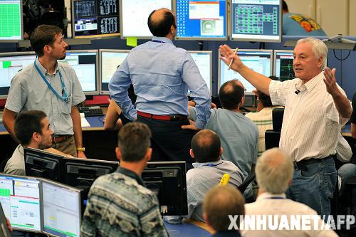 9月10日,在位于瑞士日內瓦附近的歐洲核子研究中心的大型強子對撞機控制中心,大型強子對撞機項目主任林恩·埃萬斯(右一)與在場的科學家交談。經過十幾年的建造,歐洲核子研究中心的大型強子對撞機當日正式啟動,將第一束質子束流注入對撞機。 新華社/法新
