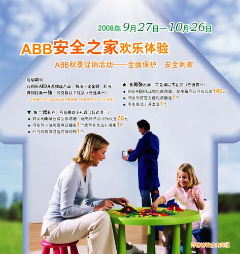 為突出ABB整體家居安全概念,配合微型斷路器、配電箱產品,體現ABB產品對家居電路的整體保護,ABB(中國)有限公司低壓部在北京、廣州、成都等十余個重點城市推出“ABB安全之家歡樂體驗”的十一促銷活動,活動從9月27日開始,一直延續到10月26日,貫穿整個秋季裝修旺季。