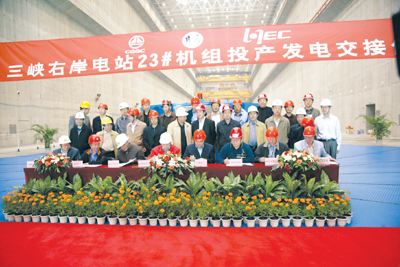 10月9日,三峽右岸電站國產化700兆瓦機組———23號機組移交三峽電廠運行管理并正式投入商業運行。標志著由哈爾濱電機廠有限責任公司為三峽右岸電站自行設計、自行制造、具有完全自主知識產權的空冷水電機組全部保質保量按期完工。不僅兌現了哈電人對三峽工程開發總公司的承諾,而且彰顯了該公司研發“大水電”的雄厚技術實力和一流生產制造水平。三峽工程開發總公司、葛洲壩集團、長江電力、哈電集團的有關領導、專家等共同見證了“中國創造”輝煌成果的成功投運。