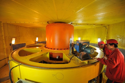 10月29日工作人員在對三峽工程右岸電站15號發電機組進行檢查。