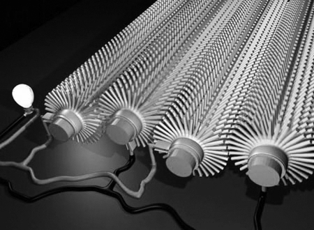 如今,美國亞特蘭大市佐治亞理工學院的一名科學家已經實現了這一突破。在3月26日于猶他州鹽湖城召開的美國化學會全國大會上,材料科學家王中林向與會者介紹了他們研制的第一臺納米發電機。這一裝置依賴于像剛毛一樣纏繞在一個金屬電極以及被夾入一個剛性聚合物內部的具有彈性的氧化鋅納米線。當施加壓力后,這種聚合物會向著氧化鋅納米線彎曲,從而產生電流。