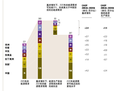 如果發展中國家能提高能源生產率,大筆收益唾手可得。麥肯錫全球研究院 (MGI) 的研究表明:未來12年,這些國家可將自身能源需求增長減少一半以上,使年增長率從3.4%降至1.4%。這樣一來,2020年的能源需求預期可降低25%左右(圖表1)。削減的數量已超出中國現在的總能源消耗。