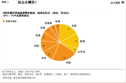 某些現有節能技術可通過未來節約的能源收回成本,僅靠應用這些技術,到2020年,消費者和企業即可節約6,000億美元。在本土市場率先重視提高能源效率的公司將占據優勢地位,它們將在全球 “綠色”產品和服務市場尚未成熟時就執得牛耳。實際上,在既能提高能源生產率又能帶來正投資回報的機會中,有65%存在于發展中地區(圖表2)。