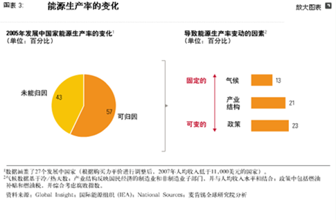 MGI 計算得出,發展中國家當前的能源生產率變化多半源于氣候、產業結構和能源政策(圖表3)。某些極端氣候下,人們必須使用取暖和制冷系統,這不可避免地導致某些地區的單位 GDP 能耗增加。高度工業化等因素也必須考慮在內,因為擁有大型制造業的國家往往要消耗更多能源,且能源生產率較低。但說到能源政策,發展中國家還是有調整的空間。MGI 指出了四個需要優先采取行動的方面。