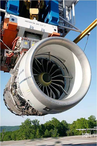 美國通用電氣公司和法國斯奈克瑪公司的合資公司CFM公司制造的LEAP-X型號發動機,被稱為第一種第三代民用航空渦扇發動機。這是2009年6月12日在GE集團位于俄亥俄州Evendale工廠的高空試驗臺上,LEAP-X發動機的核心機首次點火的圖片。這里將在整個飛行包線內檢驗渦輪和燃燒室的性能。該核心機由8級壓氣機與單級渦輪組成,CFM公司說:“我們希望核心機能有更高的熱效率,我們想要提高核心機的溫度從而提高熱效率,以此確保渦輪葉片的效率和耐久性。”