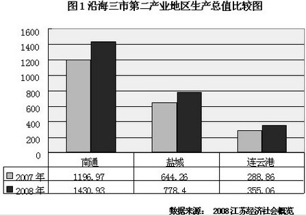 產業布局的“雙轉移”,加快了江蘇沿海產業帶的建設。2008年,南通、連云港、鹽城三市規模以上工業實現增加值分別比上年增加17%、18.1%和18.1%,增幅高于全省的14.2%、高于蘇南的12.2%和蘇中的16.9%。
