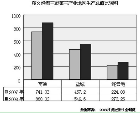2008年,江蘇沿海三市實現地區生產總值4863.49億元,比上年增長18.57%,占全省的16.05%,其中工業生產總值2152.86億元,比上年增長19.82%,占沿海地區生產總值的44.27%,比上年提高0.47個百分點,三次產業增加值保持快速增長,增速分別高于4%、12.9%和12.7%的全省平均水平,尤其是第二、第三產業增加值增速更為明顯,工業經濟發展強勁。港口物流業也得到了強勢發展,2008年,連云港港全年完成貨物吞吐量10060萬噸,同比增長18.3%,成功躋身億噸大港行列,港口集裝箱完成300.05萬標箱,增長49.9%,繼續保持沿海十強、全球百強港地位。同時南通、連云港、鹽城三市的人均生產總值同比增幅分別達到19.7%、22.01%、18.20%,增幅快于全省16.78%的平均水平。