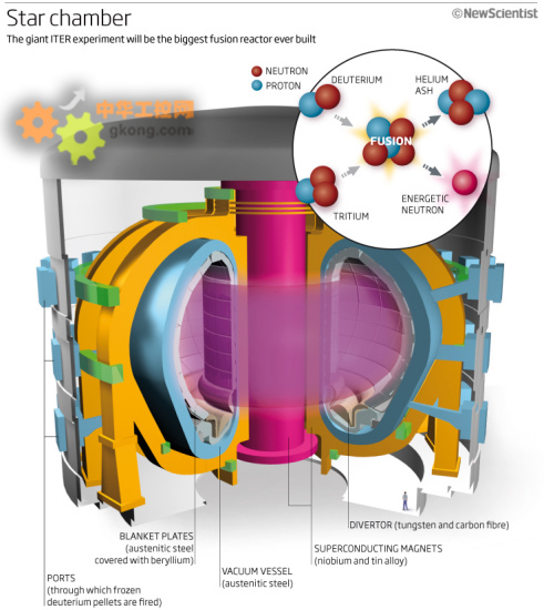 國際熱核實驗反應(yīng)堆(ITER, International Thermonuclear Experimental Reactor)計劃也被稱為“人造太陽”計劃,由歐盟、中國、美國、日本、韓國、俄羅斯和印度等7方共同參與,與國際空間站、歐洲大型強子對撞機、人類基因組計劃一樣,是一個龐大的國際科技合作項目,需要多國科學家合作才能完成。其目的是借助氫同位素在高溫下發(fā)生核聚變來獲取豐富的能源。其原理類似太陽發(fā)光發(fā)熱,即在上億攝氏度的超高溫條件下,利用氘、氚的聚變反應(yīng)釋放出核能。核聚變?nèi)剂想碗翱梢詮暮K刑崛。司圩兎磻?yīng)不產(chǎn)生溫室氣體及核廢料。由于原料取之不盡,不會危害環(huán)境,這一計劃的實施結(jié)果將決定人類能否迅速地、大規(guī)模地使用核聚變能,從而可能影響人類從根本上解決能源問題的進程,因此,意義和影響十分重大。