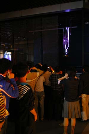 磁電大舞臺是基礎科學展廳的一大亮點,市民可進入該舞臺內的“法拉第籠”,身后的工作人員按動操作按鈕,附近的放電裝置便會發出100萬伏的高壓電流到法拉第籠上,電流在空中放出一條條閃電,好似科幻片中的場景。而全金屬制作的法拉第籠將電流導走,身處籠內的參觀者安然無恙。