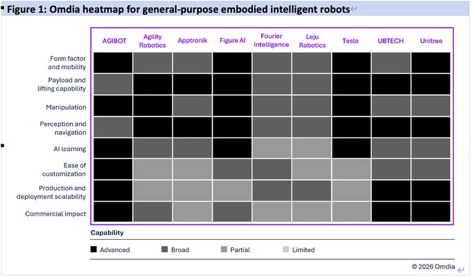 Omdia利用其基于熱力圖的評估模型,從八個維度對全球領先企業進行了評估,包括形態與移動性、負載與起重能力、操作能力、感知與導航、AI學習能力、定制易用性、生產與部署擴展性以及商業影響力。智元機器人在其中六個評估維度中獲得了最高評級——“領先”(Advanced),是本次評估中獲得頂尖評級數量最多的公司。