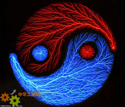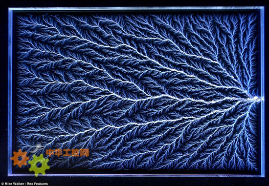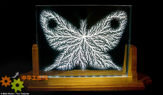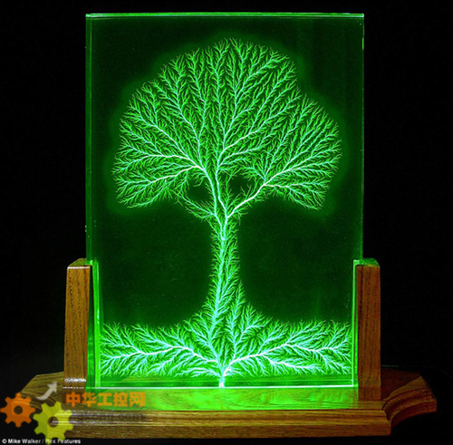 據英國《每日郵報》12月3日報道,美國伊利諾伊州雕刻家波特·赫克曼,用500萬伏的粒子加速器對著玻璃板轟出完美圖案,如同將閃電凍結在冰塊中似的。
