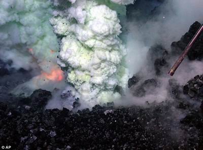 這是研究人員第一次成功拍攝到海底火山噴發的情景,其景象非常壯觀,亮紅色的熔巖泡釋放出煙霧狀硫磺,當它們接觸冰冷的海水時就直接成為黑色巖石沉入海床之中。潛水機器人能夠盤旋在海底火山熔巖噴發氣流的上方,它的機械手臂能夠采集到熔巖樣本。