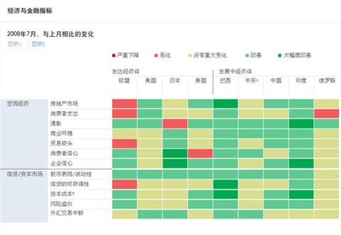 不確定性的第二個原因是所能獲得的對正在發生的經濟事件的相關信息讓人難以理解,這些信息通常都以只言片語的形式提供,缺乏對各種指標的真正含義的解釋。我們對9個發達和發展中經濟體的宏觀經濟、信貸和資本市場活動的12個指標進行了追蹤。如果用7月份的指標與前一個月進行比較,就會發現108個指標中有60個出現了改善。但另一方面,與前一年危機爆發前的情況相比,有68個指標顯著表明情況有所惡化(通常是嚴重下降)。其中每個指標都有可能成為報紙的頭條新聞。我們相信,如果不對包括指標的相互關聯性在內的更為廣泛的情況進行分析,要了解當前的經濟環境,是根本不可能的。(見互動圖表,“經濟與金融指標”)。