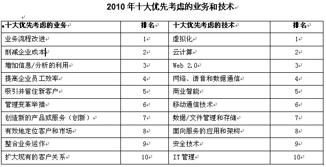 Gartner集團副總裁兼Gartner EXP調研主管Mark McDonald 表示,隨著經濟從衰退過渡到復蘇,企業的戰略也從削減成本、提高效率轉型到創造價值、提高生產力上。而技術也正從“重”所有者經營的解決方案轉型到“輕量”服務上。CIO不僅僅要管理IT資源,更要擔負起管理業務結果的重大責任。與此同時,CIO也把2010年看作是加速IT從支持的角色向成為側重革新和競爭優勢的策略貢獻者轉型的一年。