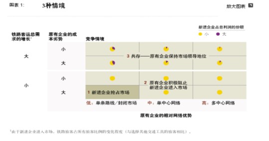 如果鐵路需求可以被刺激起來,參與者將可能在共同盈利的情況下共存。但模型顯示,即使是在進(jìn)攻者享有最佳條件的情況下,原有企業(yè)仍可能保持市場領(lǐng)導(dǎo)地位。由于原有企業(yè)通常能夠容忍進(jìn)攻者進(jìn)入小規(guī)模市場,因此,理性的進(jìn)攻者比較傾向于接受這樣的格局。任何一方更具侵略性的行動都會引發(fā)毀滅性的價格戰(zhàn)或服務(wù)的擴(kuò)張,破壞行業(yè)整體的盈利性。