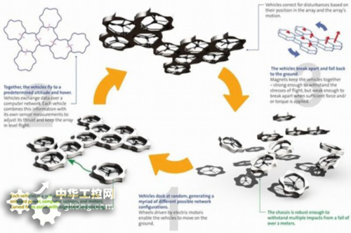 單個四軸飛行器都具有固定螺旋槳,可以驅動它們升空,由這種方式驅動的飛行總是飄忽不定,而且不受控制。不過,一旦接在一起,這些相對簡單的小機器人立即就變成復雜的多螺旋槳系統,可以協調飛行。每個無人機組都配備了馬達、電腦和傳感器。除了微型螺旋槳導管系統,它們下方還有幾個小輪子,令其可以在地面爬行尋找對方重組。