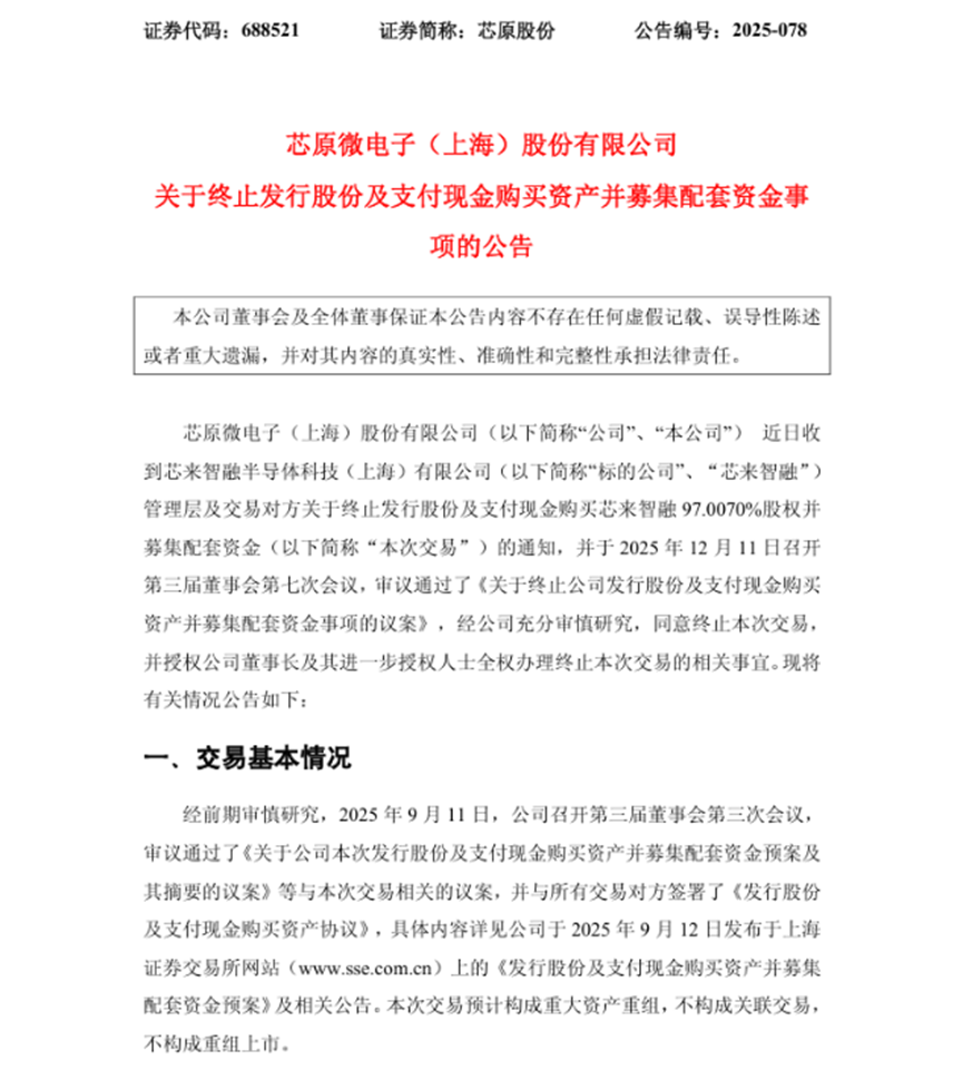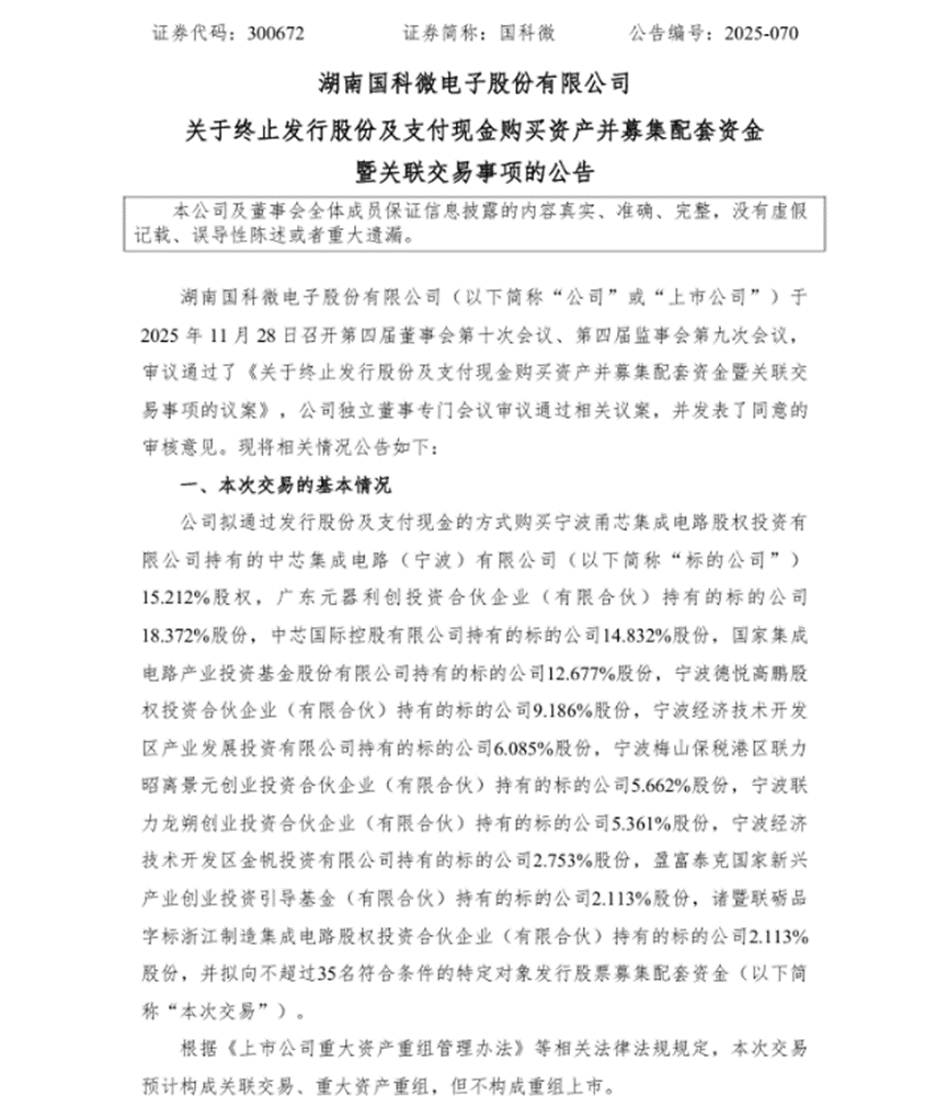 以湖南國科微電子股份有限公司(以下簡稱“國科微”)終止收購中芯集成電路(寧波)有限公司(以下簡稱“中芯寧波”)為例:2025年11月28日,采用無晶圓廠半導體公司商業模式的國科微宣布終止收購晶圓代工企業中芯寧波94.366%股權。中芯寧波專注于特色工藝代工,國科微原計劃通過此次交易,推動其在高端濾波器、MEMS特種工藝代工等領域的布局,拓展智能手機、智能網聯汽車等下游市場,但因“交易相關事項無法在預計時間內達成一致”,經審慎評估后終止。