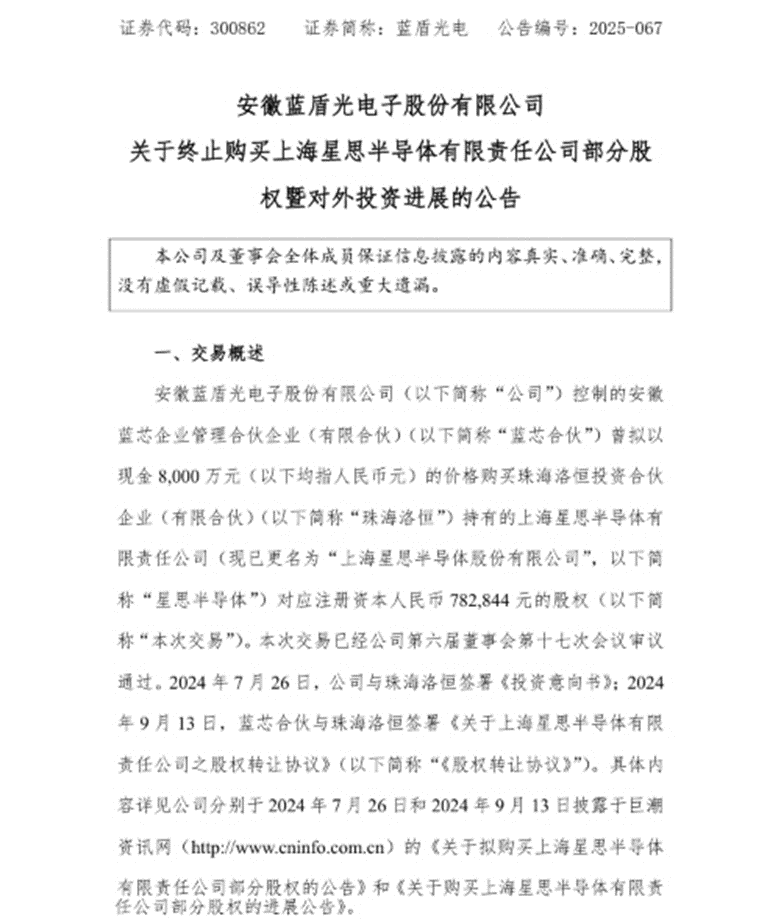 12月11日,安徽藍盾光電股份有限公司(以下簡稱“藍盾光電”)旗下安徽藍芯企業管理合伙企業(以下簡稱“藍芯管理”)終止以8000萬元現金收購珠海洛恒投資合伙企業(以下簡稱“珠海洛恒”)持有的上海星思半導體(以下簡稱“星思半導體”)部分股權(對應注冊資本78.28萬元)。其公告稱:但鑒于公司自身情況和星思半導體情況,為控制投入并減少對外投資對公司的影響,維護公司及全體股東尤其是中小股東的利益,綜合考慮各種相關因素,公司及藍芯合伙經慎重考慮并與珠海洛恒共同商議后,決定終止本次交易。
