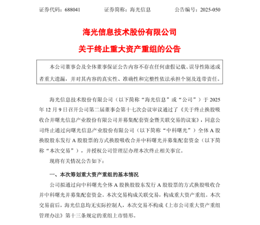 12月9日,海光信息技術股份有限公司(以下簡稱“海光信息”)與曙光信息產業股份有限公司(以下簡稱“中科曙光”)同步宣布終止換股吸收合并及配套募資計劃。該交易受“市場環境較籌劃之初發生較大變化”影響,最終因實施條件不成熟而終止,雙方表示后續仍將保持產業協同合作。實際上,雖然海光信息與中科曙光都間接或者直接與中國科學院計算所相關,且兩家公司在產業鏈上的協同效應較強,但是在兩家公司宣布開展合并計劃之后和終止合并之前,兩家公司的股價都出現了大幅的上漲,均被行業看成人工智能時代的重要算力芯片和解決方案提供商而影響了合并。
