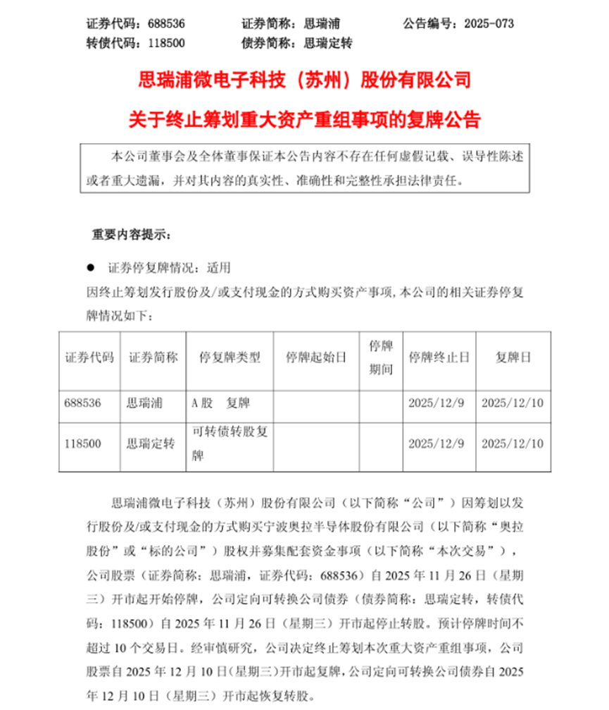 與上述交易類似,在思瑞浦微電子科技(蘇州)股份有限公司(以下簡稱“思瑞浦”)終止收購寧波奧拉半導體股份有限公司(以下簡稱“奧拉半導體”)的案例中,也隱隱可以看到IPO重啟帶來的影響:2025年12月9日,思瑞浦宣布終止以發行股份或支付現金方式收購奧拉股份86.12%股份。思瑞浦作為模擬芯片企業,原計劃通過收購國內時鐘芯片領域內的領先企業奧拉半導體,從而打造更加豐富的產品組合,但經磋商后認為“實施重大資產重組的條件尚未完全成熟”,決定終止交易。