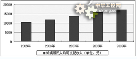 2005年—2009年城鎮居民人均可支配收入變化圖