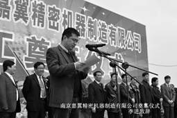 圖為南京嘉翼精密機(jī)器制造有限公司奠基儀式,董事長(zhǎng)李進(jìn)致辭。