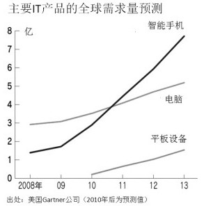 根據美國市場調查公司IDC的預測,2011年智能手機的全球售量為4億2098萬部,超過了電腦售量的3億8503萬臺。在美國Apple公司的“iPad”2010年點燃了平板電腦設備的市場需求之后,美國Gartner公司預測,2013年全球平板電腦售量有望達到1億5415萬部,接近個人電腦的30%。